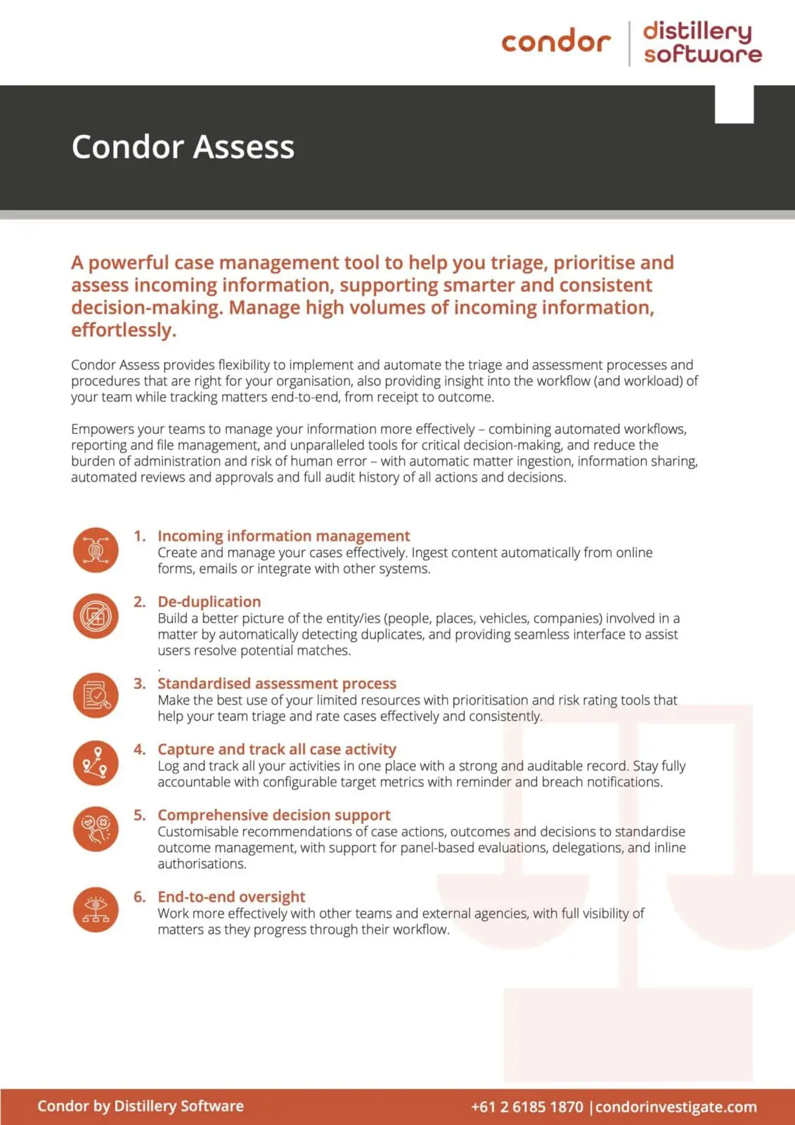 Condor Assess provides flexibility to implement and automate the triage and assessment processes and procedures that are right for your organisation, also providing insight into the workflow (and workload) of your team while tracking matters end-to-end, from receipt to outcome.