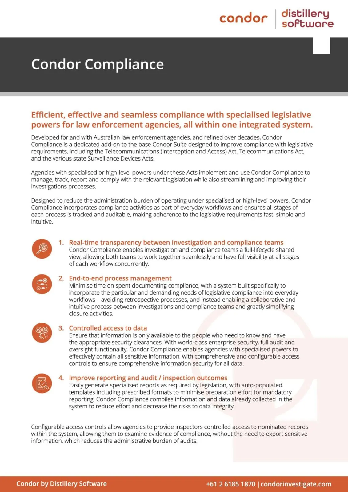Developed for and with Australian law enforcement agencies, and refined over decades, Condor Compliance is a dedicated add-on to the base Condor Suite designed to improve compliance with legislative requirements, including the Telecommunications (Interception and Access) Act, Telecommunications Act, and the various state Surveillance Devices Acts.