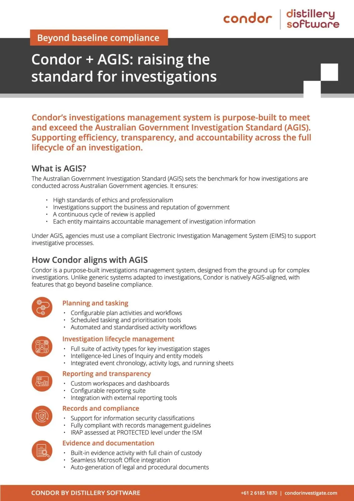 Condor’s investigations management system is purpose-built to meet and exceed the Australian Government Investigation Standard (AGIS). Supporting efficiency, transparency, and accountability across the full lifecycle of an investigation.