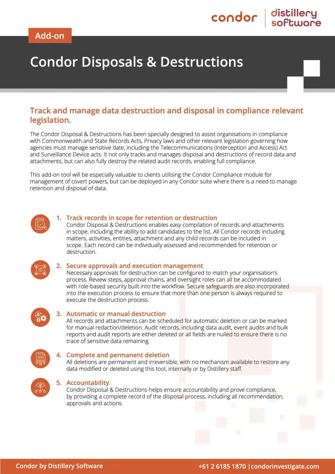 The Condor Disposal & Destructions has been specially designed to assist organisations in compliance with Commonwealth and State Records Acts, Privacy laws and other relevant legislation governing how agencies must manage sensitive date, including the Telecommunications (Interception and Access) Act and Surveillance Device acts.
