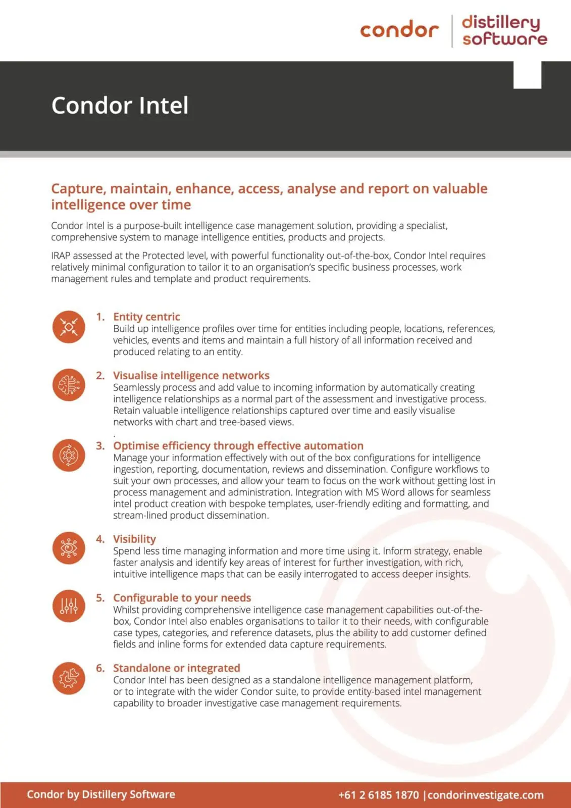 Capture, maintain, enhance, access, analyse and report on valuable intelligence over time. Condor Intel is a purpose-built intelligence case management solution, providing a specialist, comprehensive system to manage intelligence entities, products and projects.