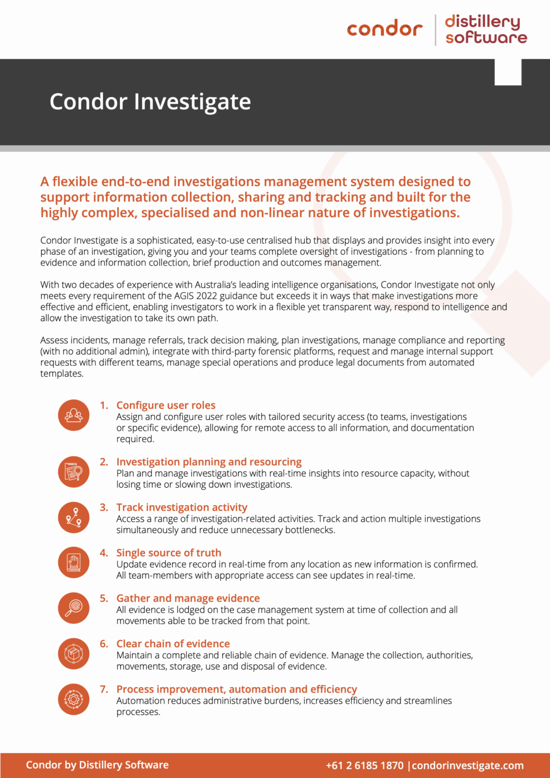 Condor Investigate is a sophisticated, easy-to-use centralised hub that displays and provides insight into every phase of an investigation, giving you and your teams complete oversight of investigations – from planning to evidence and information collection, brief production and outcomes management.