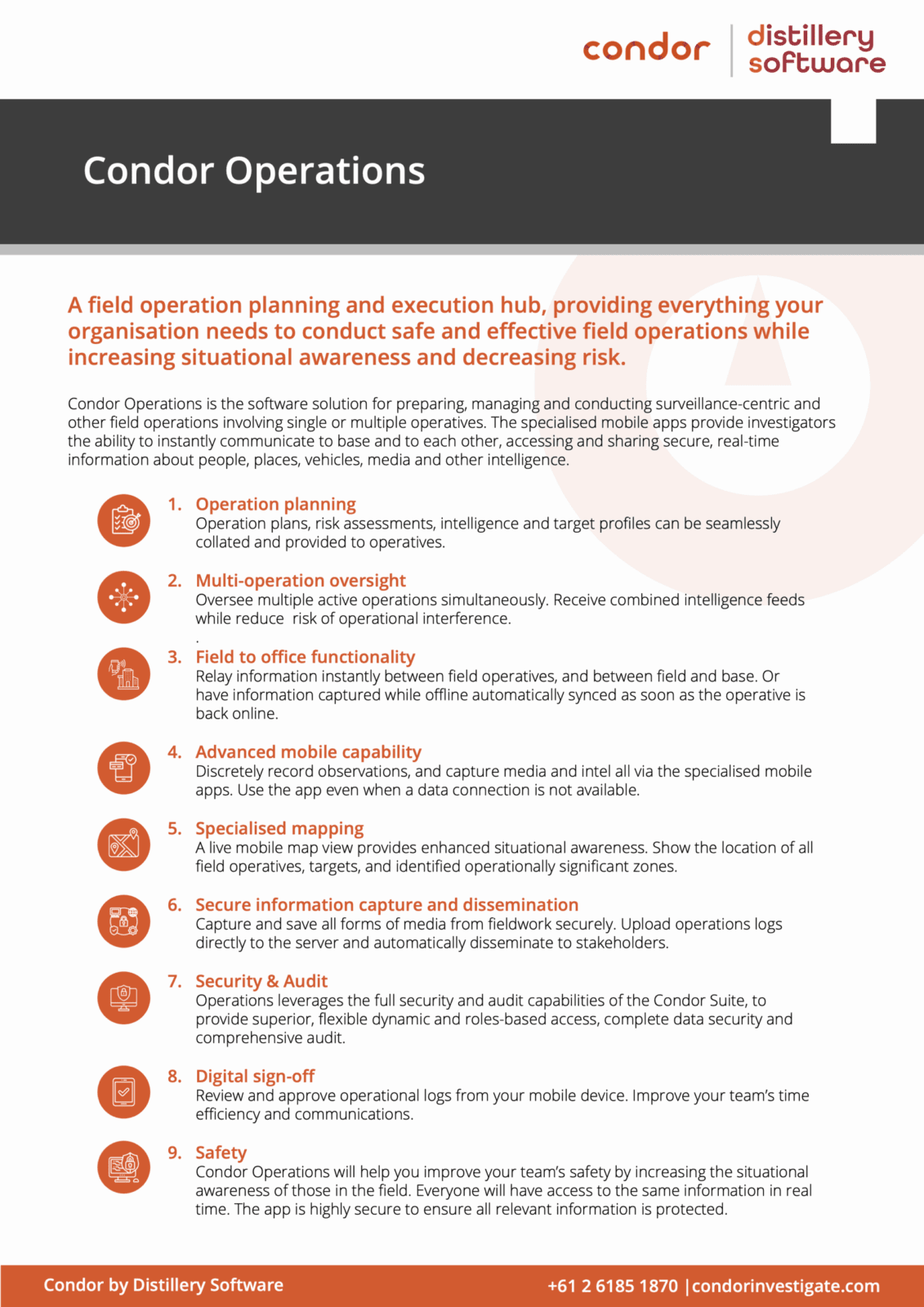 Condor Operations is the software solution for preparing, managing and conducting surveillance-centric and other field operations involving single or multiple operatives. The specialised mobile apps provide investigators the ability to instantly communicate to base and to each other, accessing and sharing secure, real-time information about people, places, vehicles, media and other intelligence.